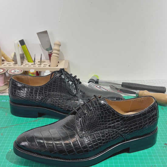 Handmade Alligator Leather Derby Shoes, Glossy Black Business Dress Shoes