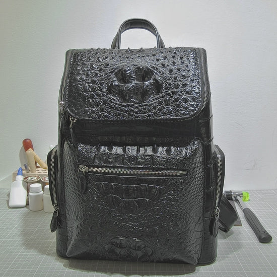 Handmade Genuine Alligator Leather Backpack, Glossy Black Multi-Zip Storage Design