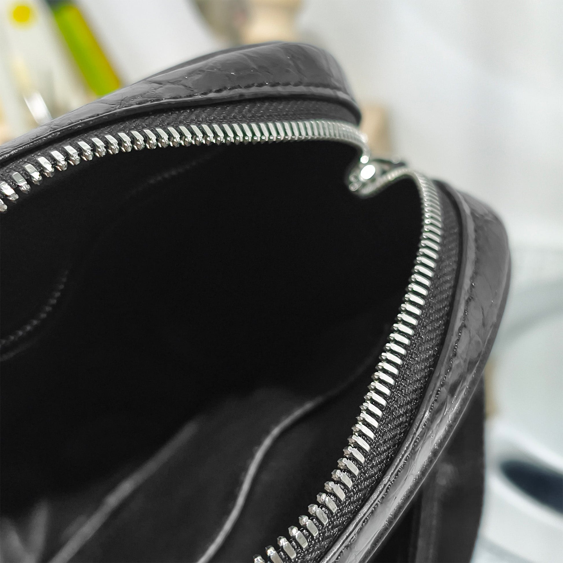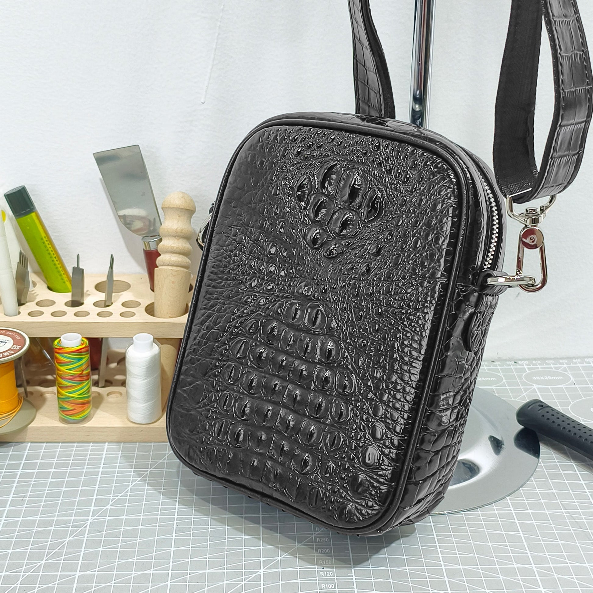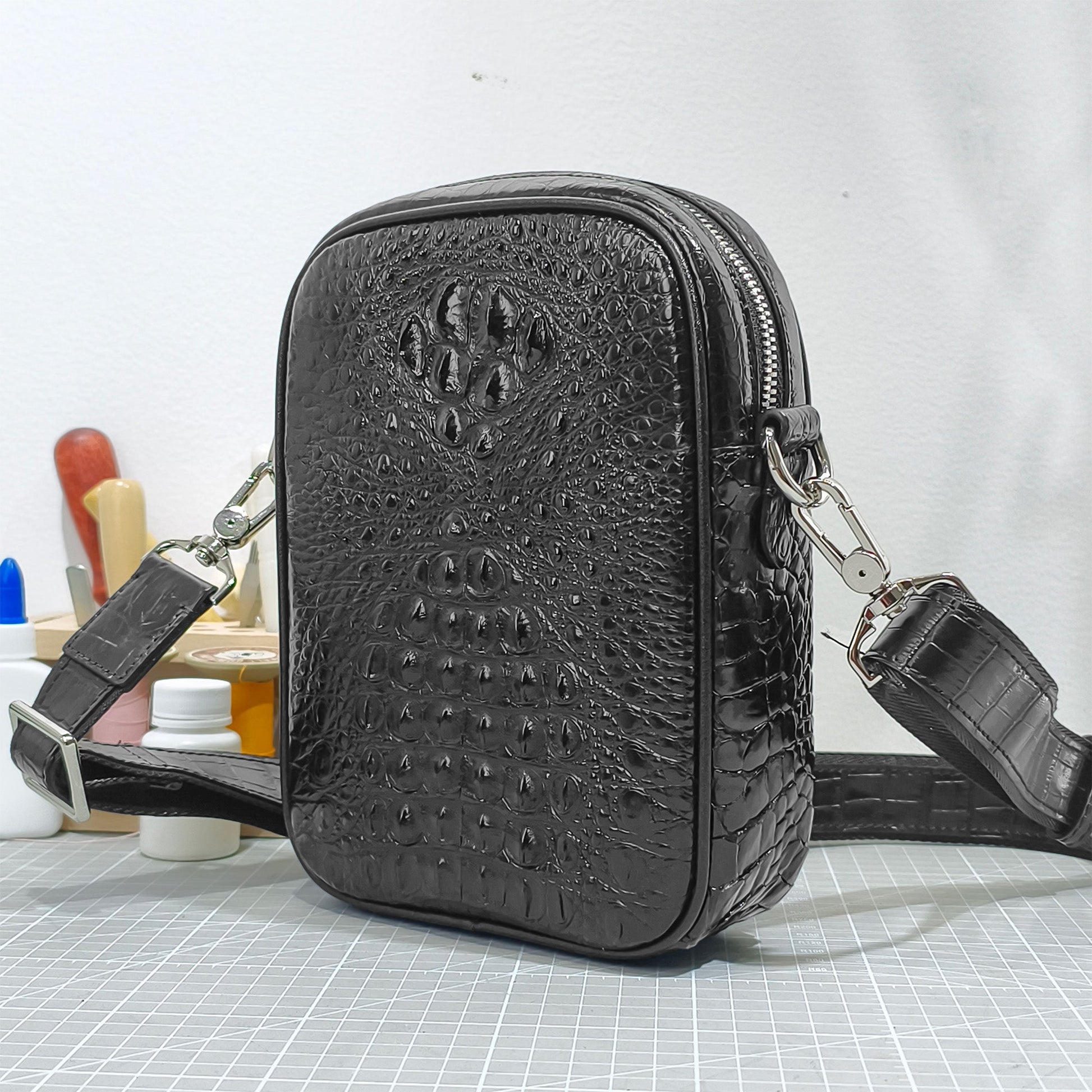 Handmade Genuine Alligator Bone Leather Crossbody Bag, Glossy Black with Distinctive Scale Texture