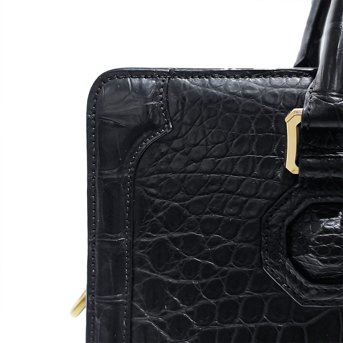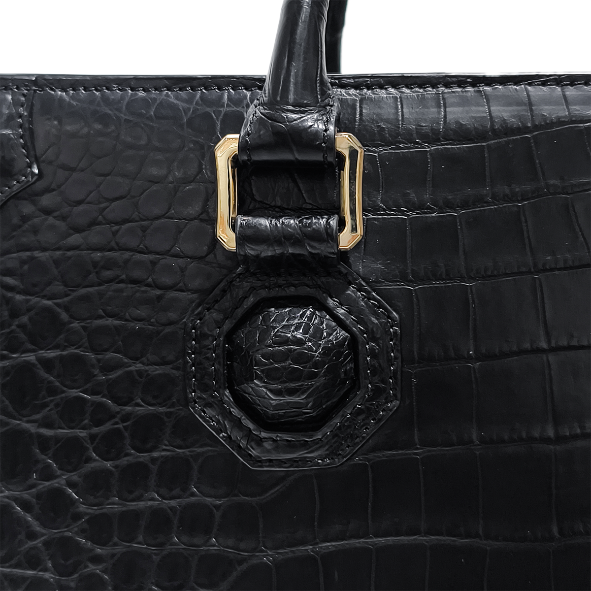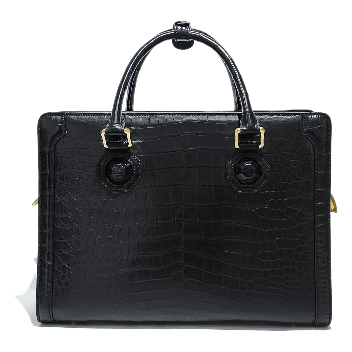 Handmade Genuine Alligator Leather Briefcase, Glossy Black with Gold Hardware & Dual-Carry Design