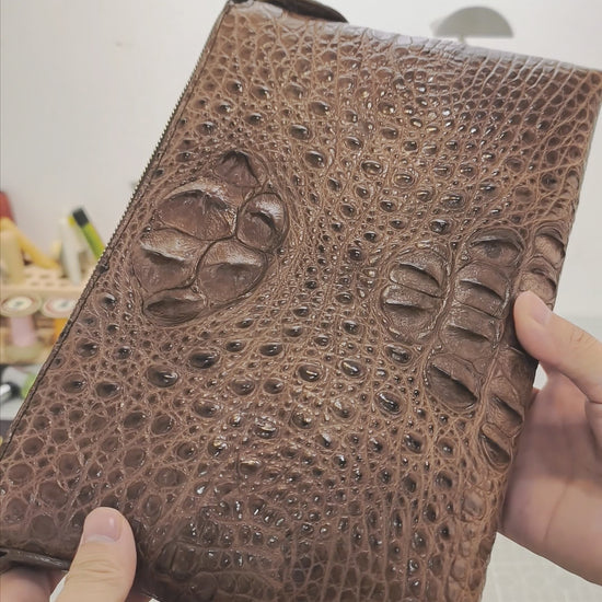 Handmade Genuine Alligator Clutch Bag, Glossy Brown Natural Texture Artisanal Zip-around Purse with Wrist Strap