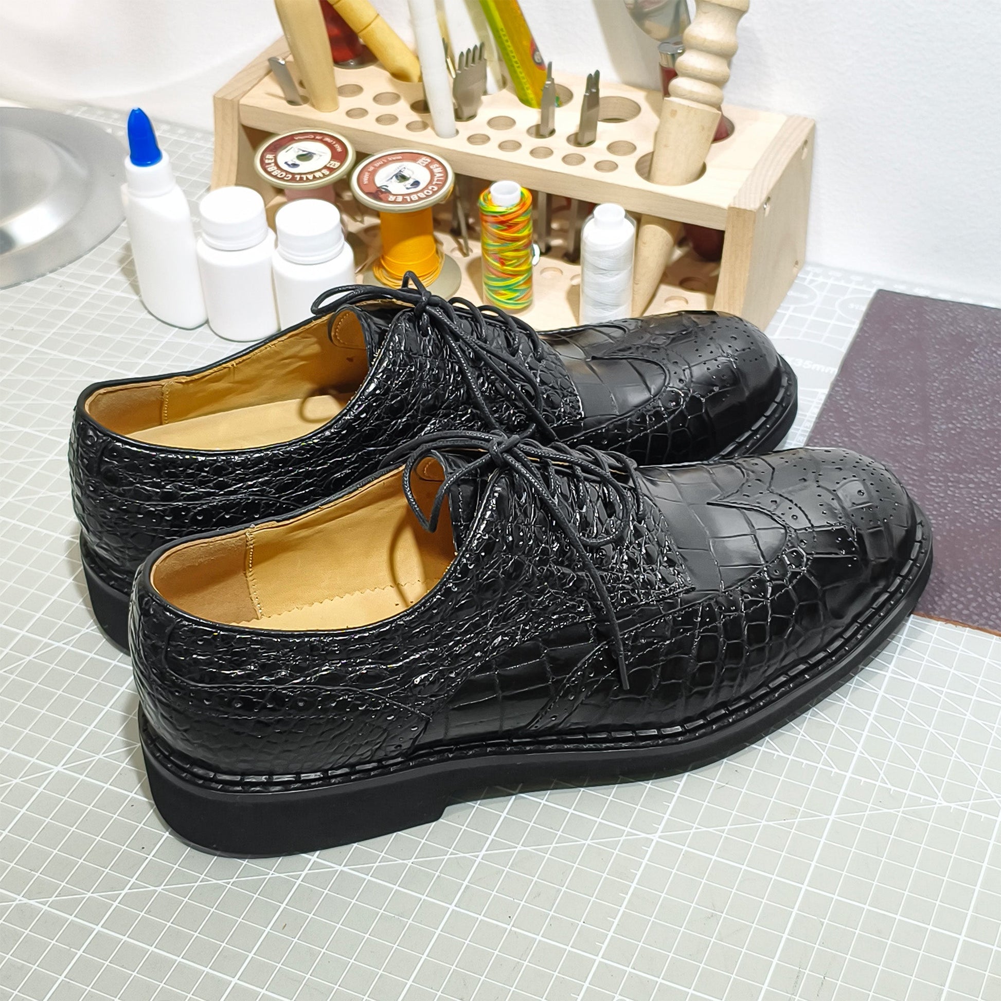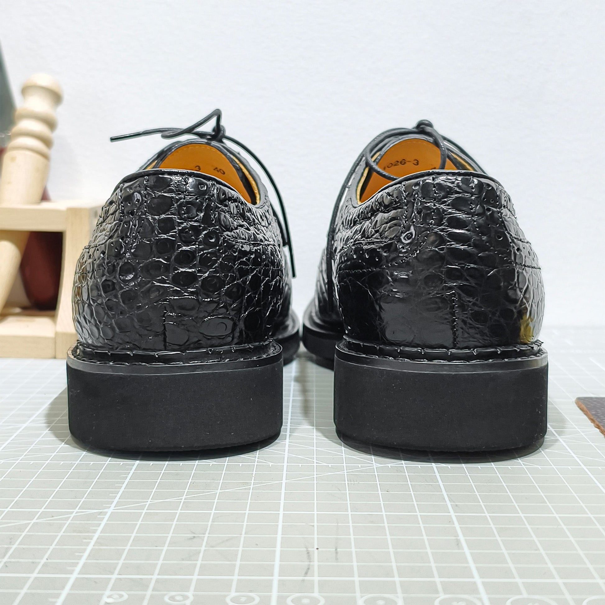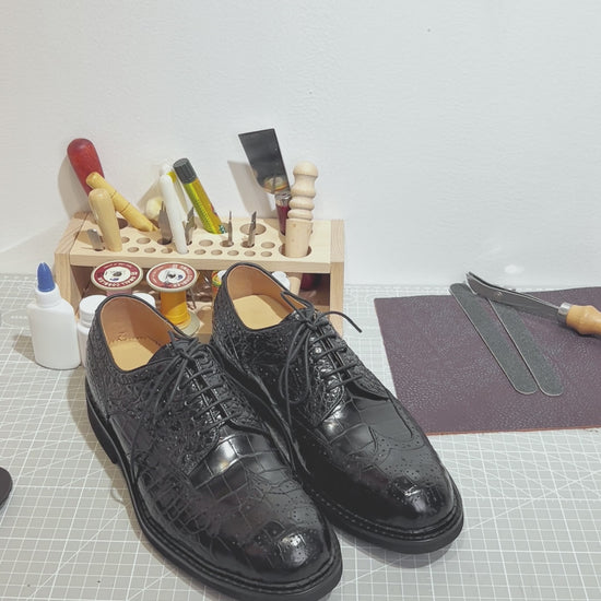 Handmade Genuine Alligator Leather Oxford Shoes, Glossy Black – Norwegian Welt & Brogue Artisanal Details