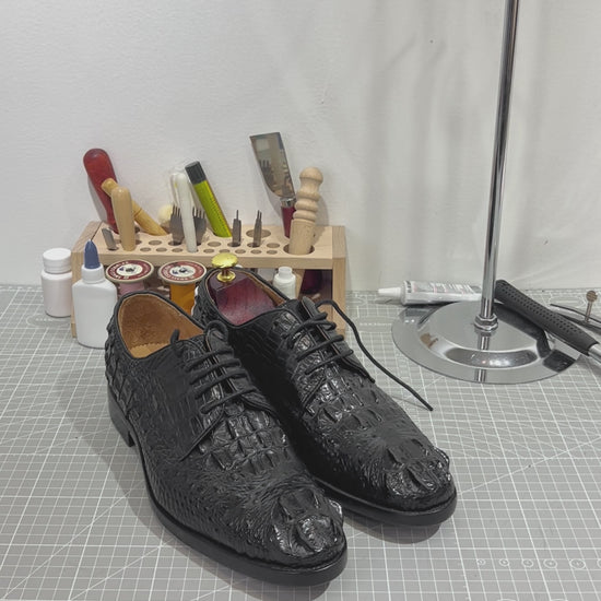 Handmade Genuine Alligator Leather Oxford Shoes, Glossy Black – Timeless Formal Luxury & Artisanal Craftsmanship