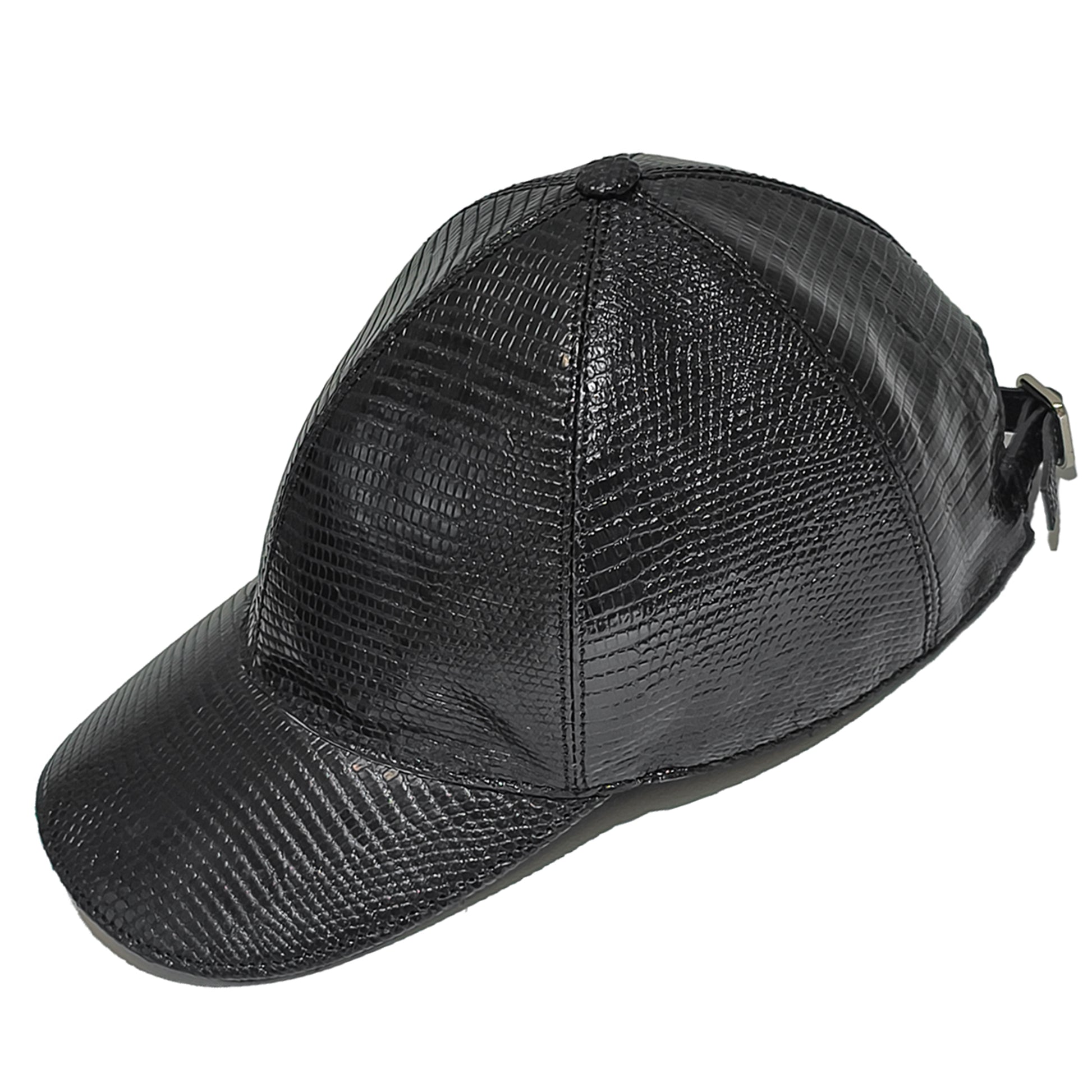 Handmade Genuine Lizard Leather Cap, Glossy Black Adjustable Design