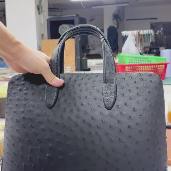 Handmade Genuine Ostrich Leather Briefcase, Matte Black with Silver Hardware & Top-Handle Design