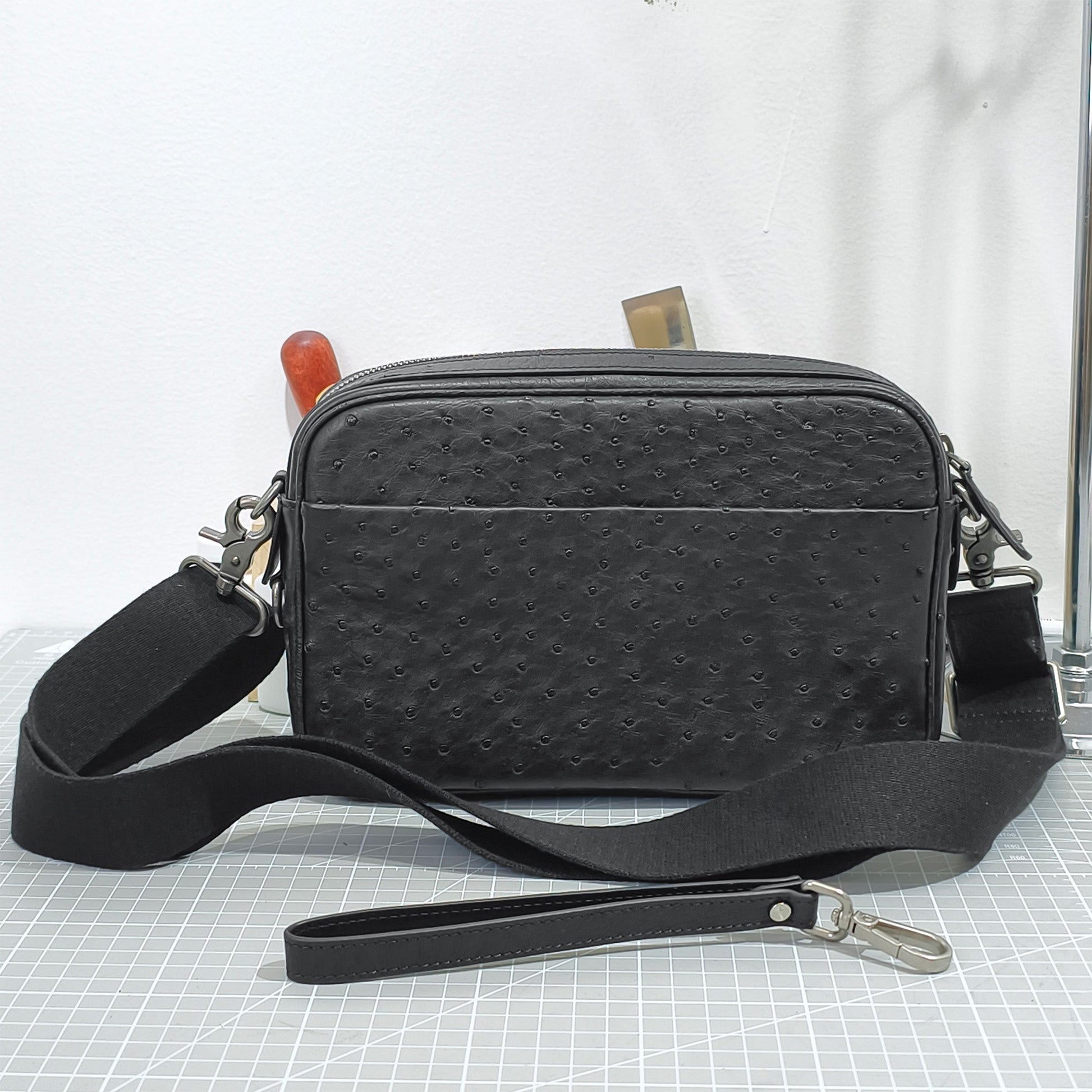 Handmade Genuine Ostrich Leather Crossbody Bag, Matte Black with Detachable Wrist Strap