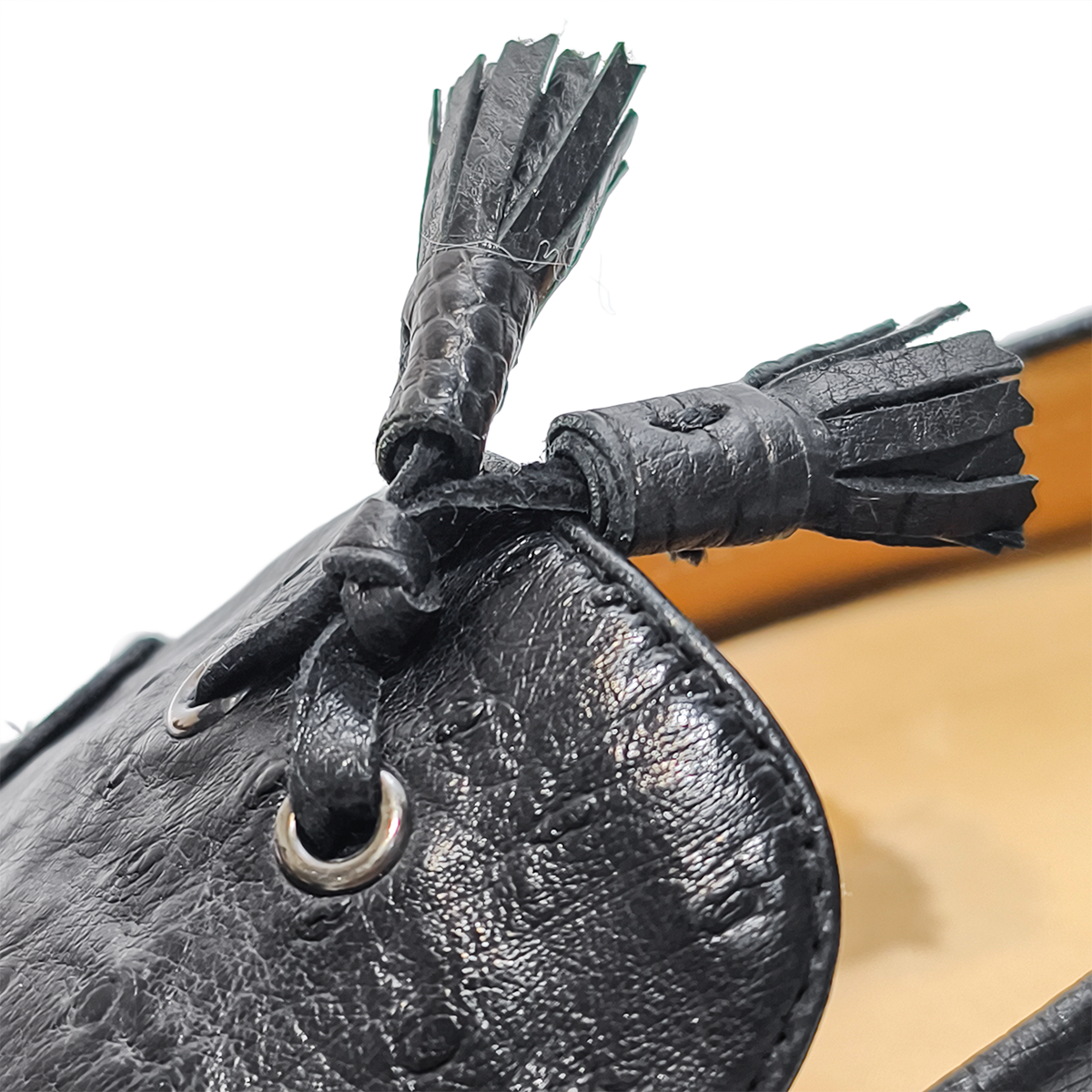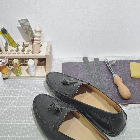 Handmade Genuine Ostrich Leather Tassel Loafer Shoes, Glossy Black