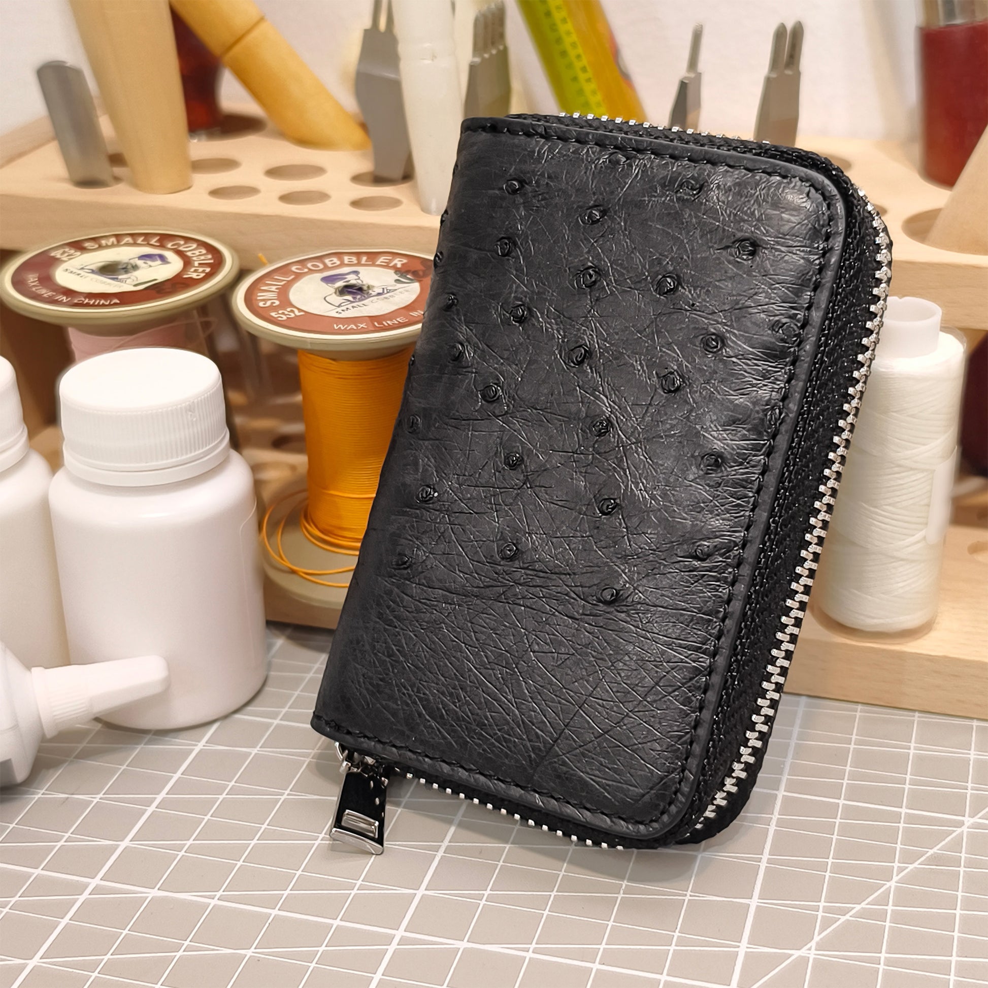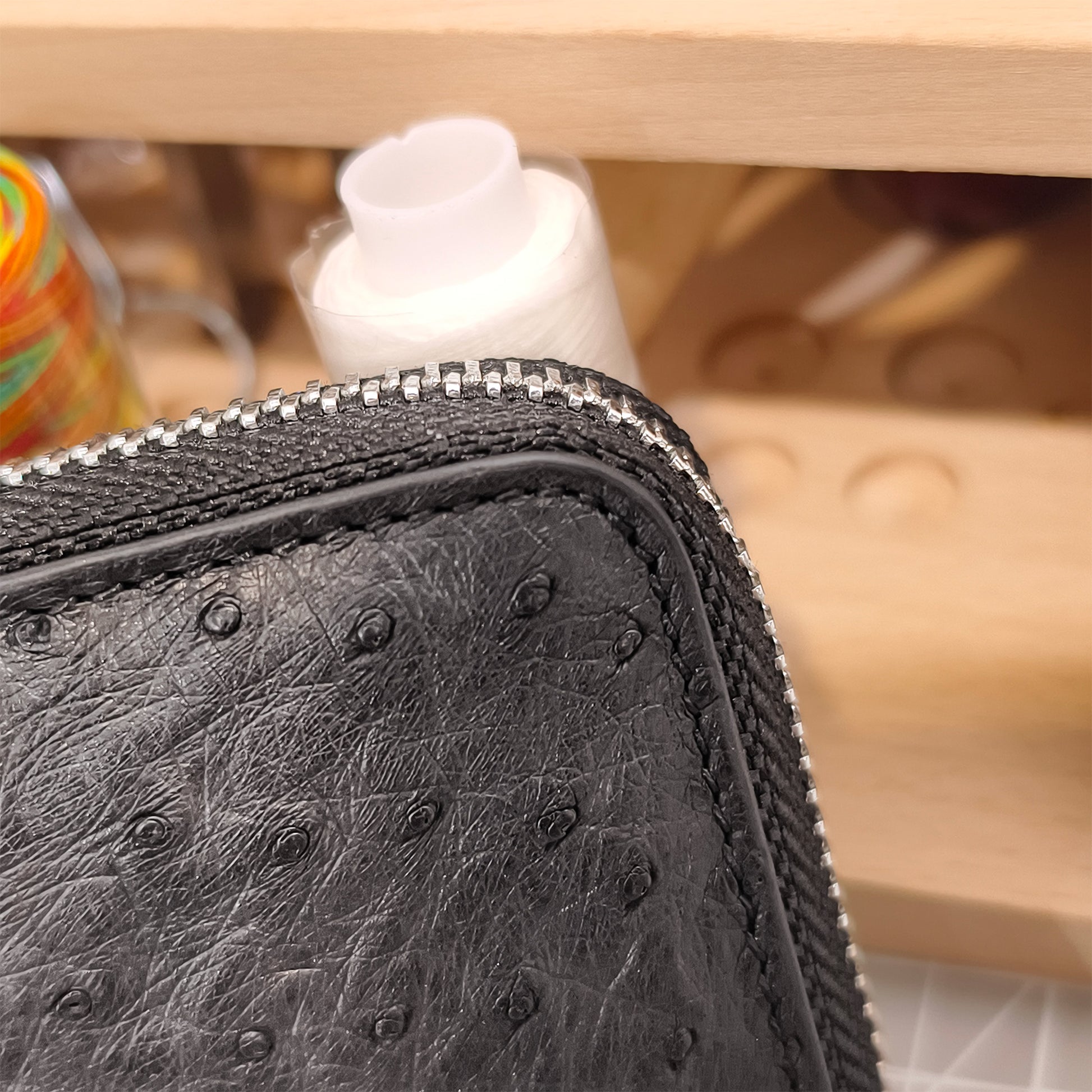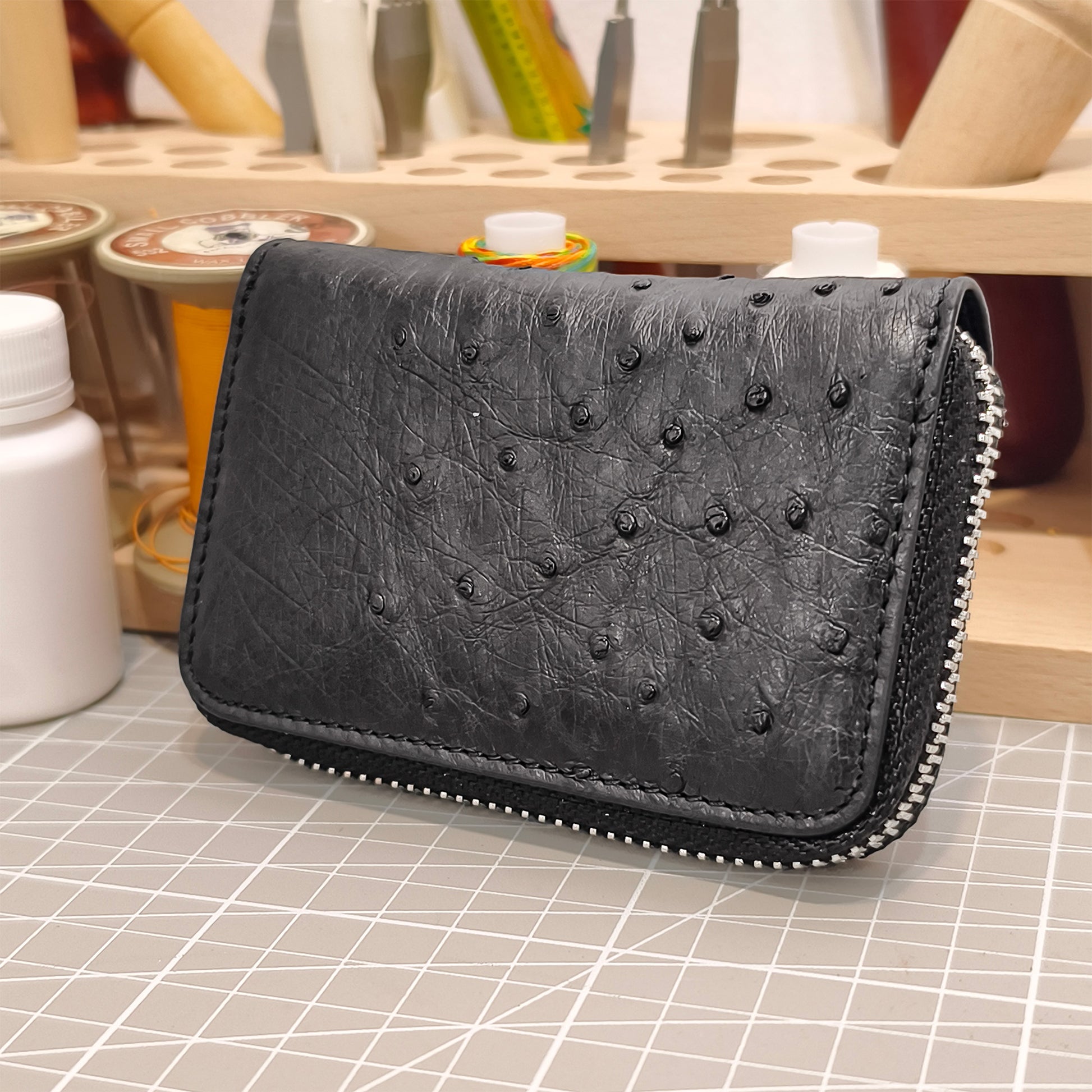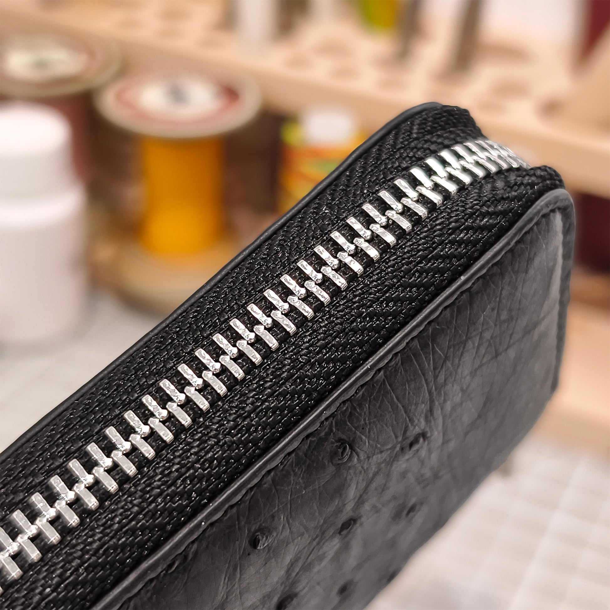 ✅ Premium Ostrich Leather: Handcrafted from ethically farm-raised genuine ostrich hide, showcasing unique natural quill-hole patterns paired with a subtle charcoal black finish for upscale, exclusive charm.