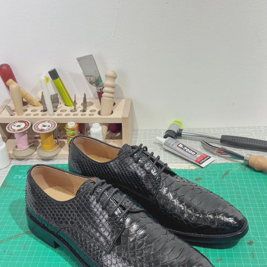 Handmade Genuine Python Leather Oxford Shoes, Glossy Black with Real Leather Sole