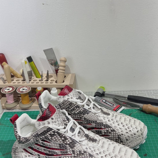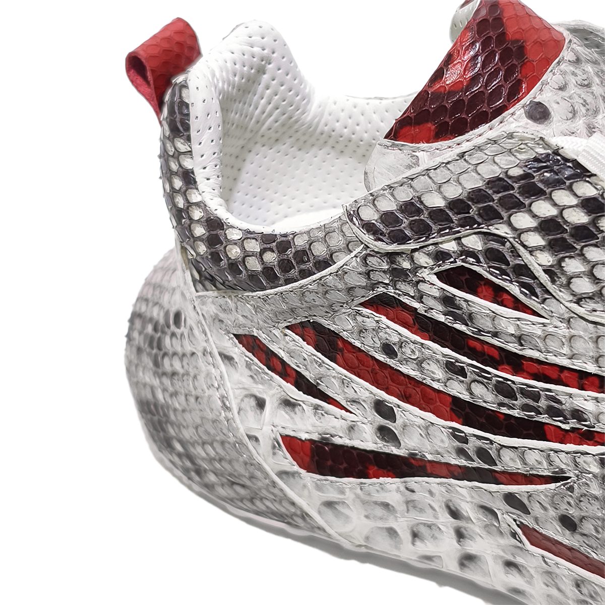 Handmade Genuine Python Leather Sneakers, White-Gray with Red Accents & Ultra-Light Sole